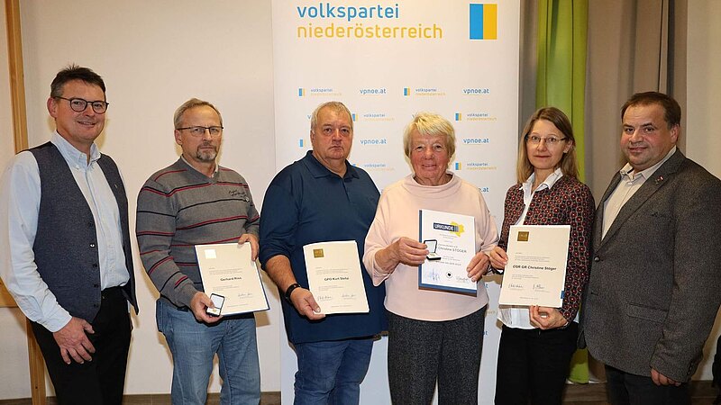 Eva Kainrath durfte als neue Gemeindeparteiobfrau gemeinsam mit ihrem Bürgermeister und dem Abgeordneten gleich eine sehr erfreuliche erste Aufgabe übernehmen und eine besondere Ehrung an gleich drei verdiente Funktionäre überreichen: