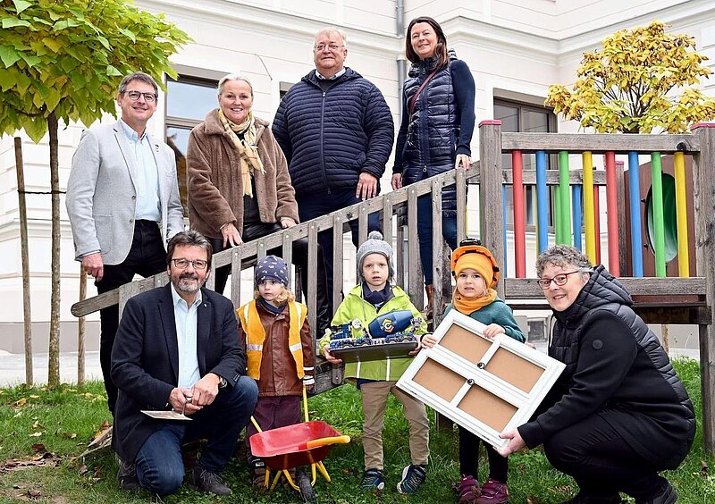 Bürgermeister Gerhard Lentschig und Familienstadträtin Maria van Dyck trafen mit LAbg. Franz Linsbauer und den Bauverantwortlichen zu einer kleinen Übergabefeier zusammen. Dabei lobte er vor allem Leiterin Claudia Langer und ihre Schützlinge: “Ich danke ganz besonders euch, dass ihr die doch ein halbes Jahr lange währende Baustellen mit all dem Lärm, Staub und diversen Umständen ausgehalten habt. Dafür habt ihr jetzt wieder einen richtig schönen Kindergarten, in dem ihr euch alle gemeinsam auch wohlfühlen könnt.”