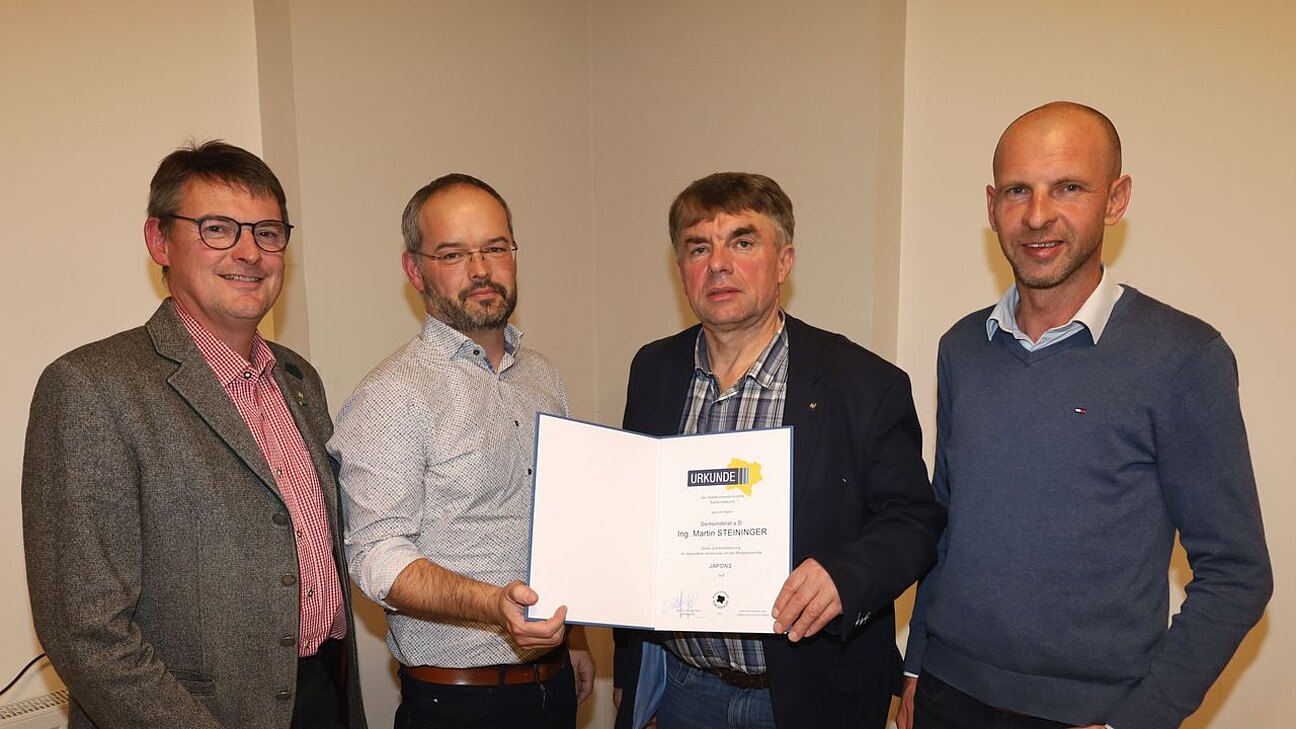 Abschließend überreichte LAbg. Linsbauer gemeinsam mit Bgm. Edi Kranzl und Vbgm. Scheimer eine Urkunde des VP-Gemeindebundes an Martin Steininger, der als ehemaliger Gemeinderat mit „Dank & Anerkennung“ geehrt wurde.